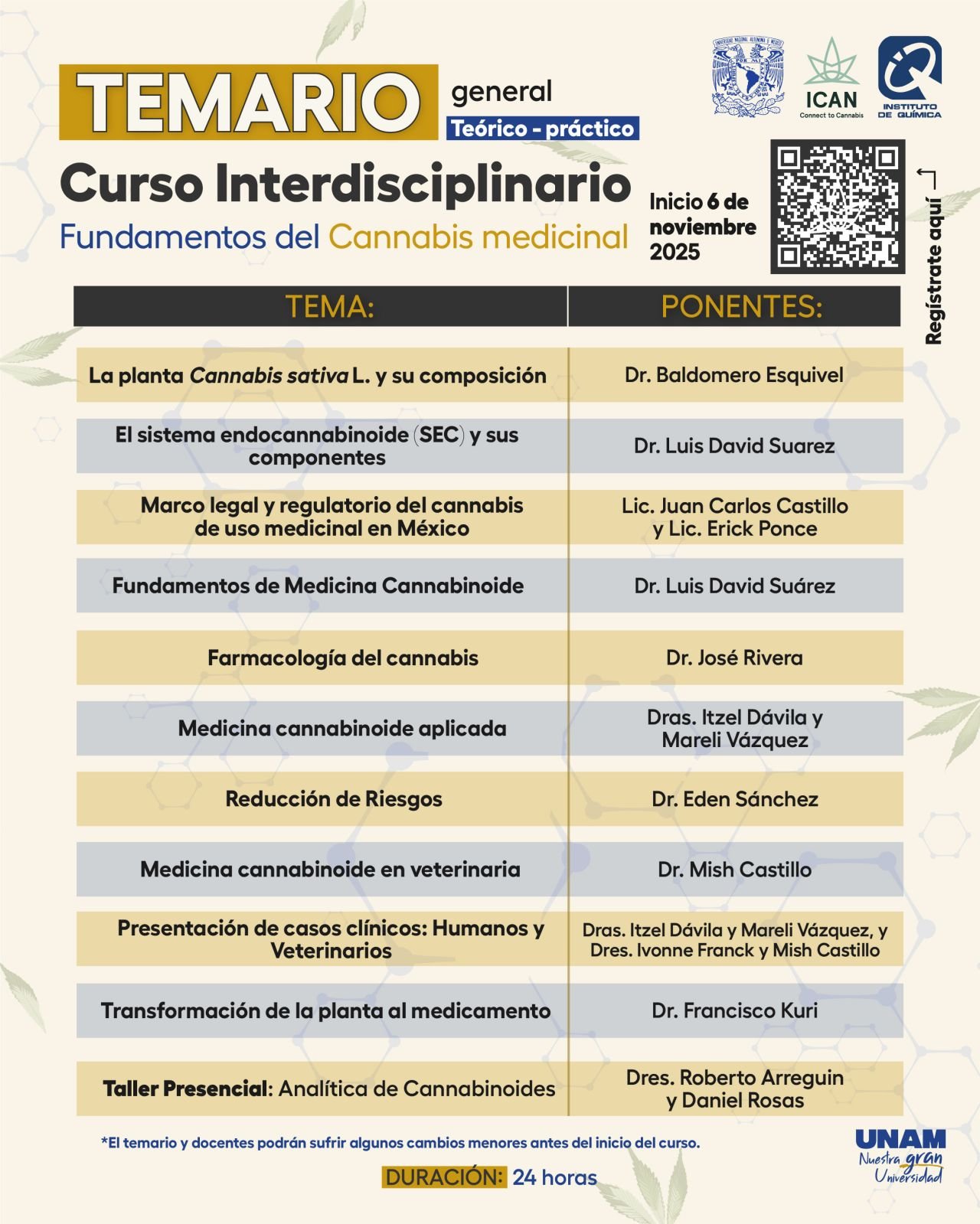 El curso contará con la guía de un destacado grupo de expertos, incluyendo al Dr. Baldomero Esquivel, Dr. Luis David Suárez, Dr. José Rivera, Dr. Eden Sánchez, las Dras. Itzel Dávila y Mareli Vázquez, quienes tienen amplia experiencia en el ámbito del cannabis legal.