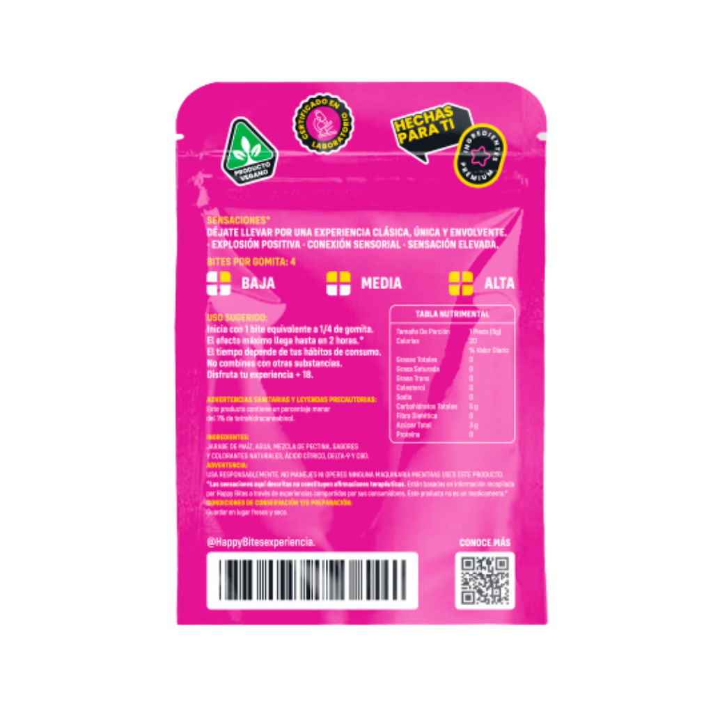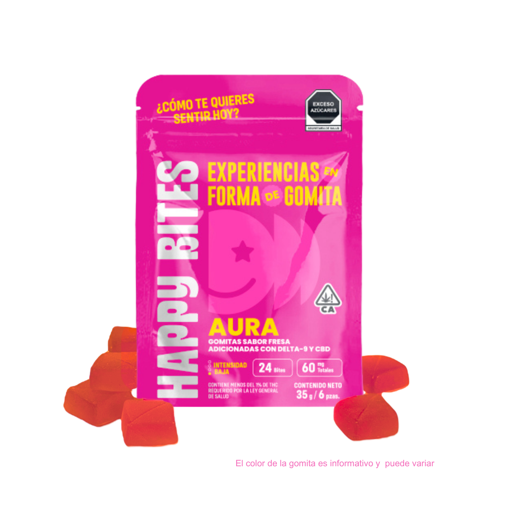 Happy Bites Gomitas AURA Sabor Fresa Mística están diseñadas para elevar el estado de ánimo, el cuerpo y los sentidos. Elaboradas con Delta 9 THC,